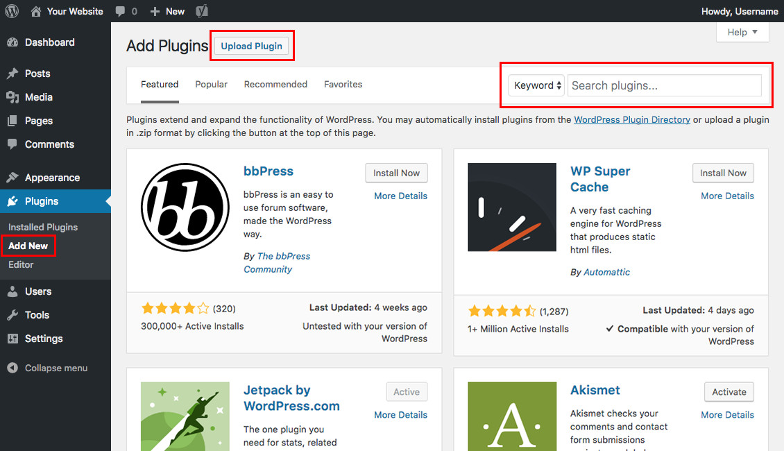 Installing plugins is very simple. From your WordPress dashboard, go to Plugins > Add New. From here, you can use the search function to find free plugins from WordPress.org, or you can click the "Upload Plugin" button to upload a zip file of a plugin you have purchased or downloaded from a third party.
